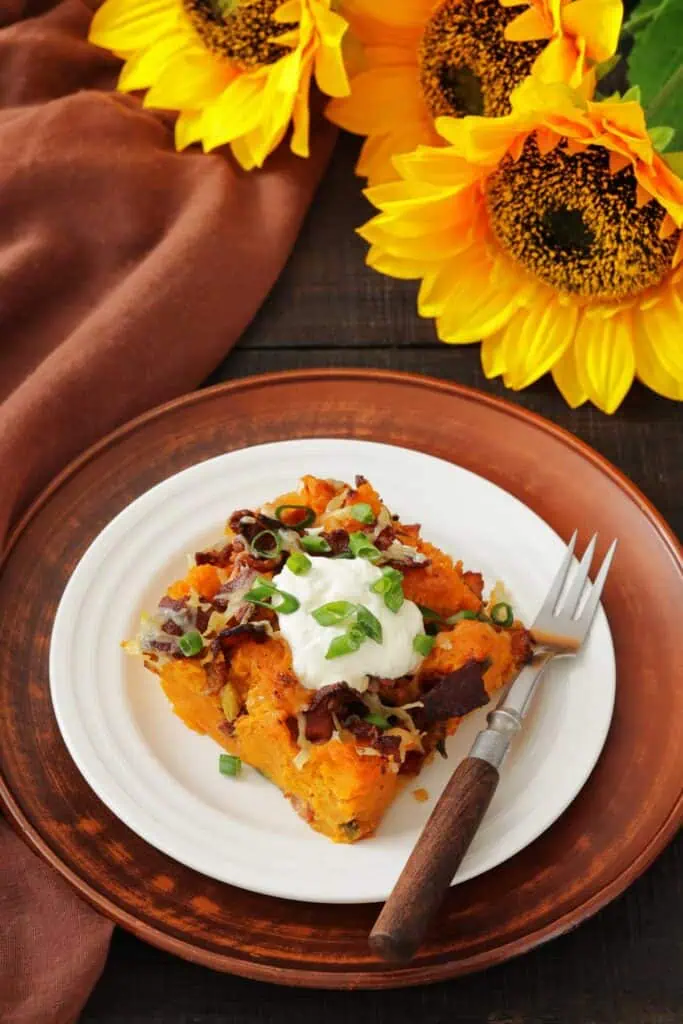 My Fully Loaded Sweet Potato Casserole combines the natural sweetness of roasted sweet potatoes with smoky bacon, tangy sour cream, and sharp cheddar cheese. The result is creamy, savory, and just a little indulgent, just like your favorite loaded baked potato but with a sweet potato twist.