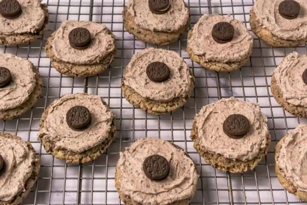 Spread a thin, even layer of frosting over each cooled cookie using an offset spatula or spoon. Top each cookie with a mini Oreo just before serving.