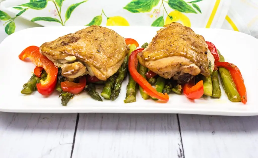 - Add the asparagus and red bell pepper, and pop the skillet into a pre-heated 375-F oven for 10-15 minutes or until the internal temperature reaches 165-F.