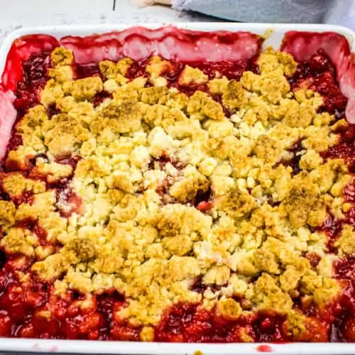 Watch for the fruit filling to bubble up in the middle of the crumble. Alternatively, you can pull the crumble apart in the middle of the casserole, to get a peek inside. The fruit filling should be ruby red, thick, and translucent.